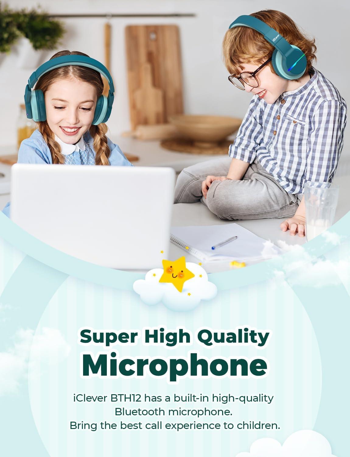 iClever BTH12 Kids Bluetooth Headphones,Colorful LED Lights Kids Headphones Wireless,74/85dBA Safe Volume,85H Playtime,Fast Charging,Bluetooth 5.2,Over Ear,Built-in Mic for iPad/Tablet/Airplane,Blue(Malachite Green)