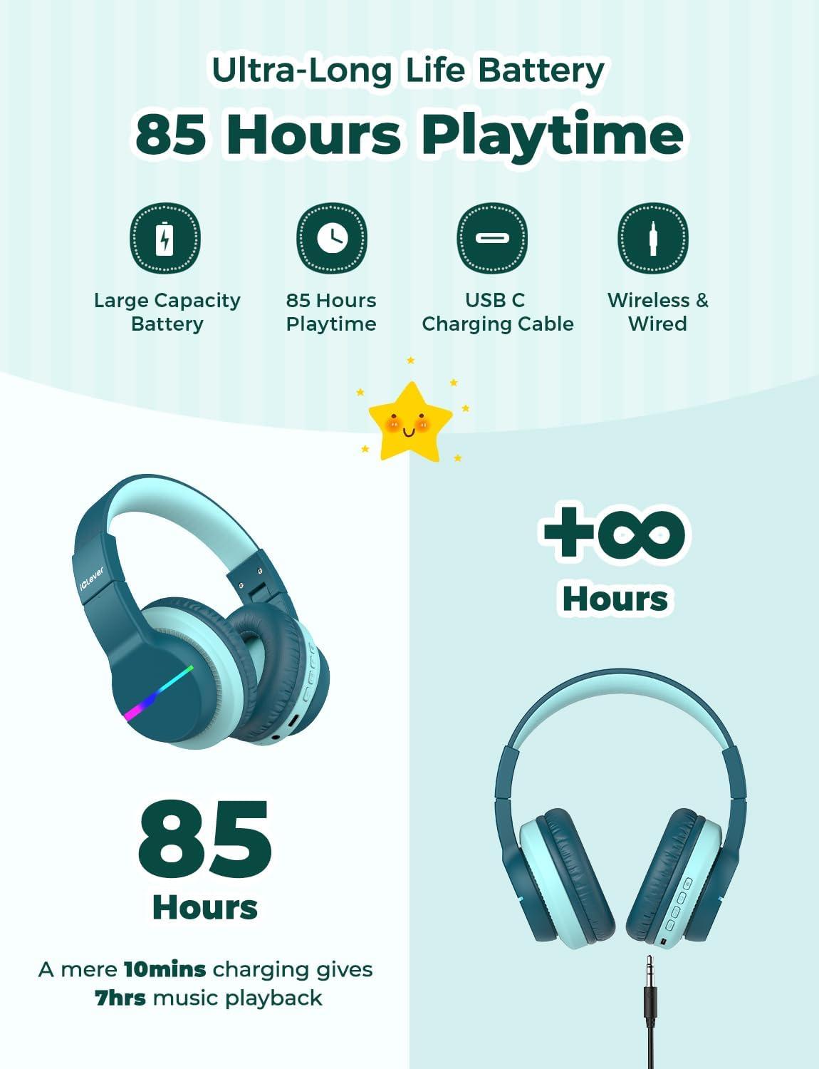 [85H Playtime & USB C Charging]: Dead batteries are a thing of the past thanks to the amazing battery life in the BTH12 Bluetooth kids headphones. Packed with rechargeable battery and has a playtime of 85 Hours! It uses a USB-C cord for incredibly fast charging. Just 10 minutes gives you 7 hours of playtime! Use with AUX or wireless for ultimate versatility!