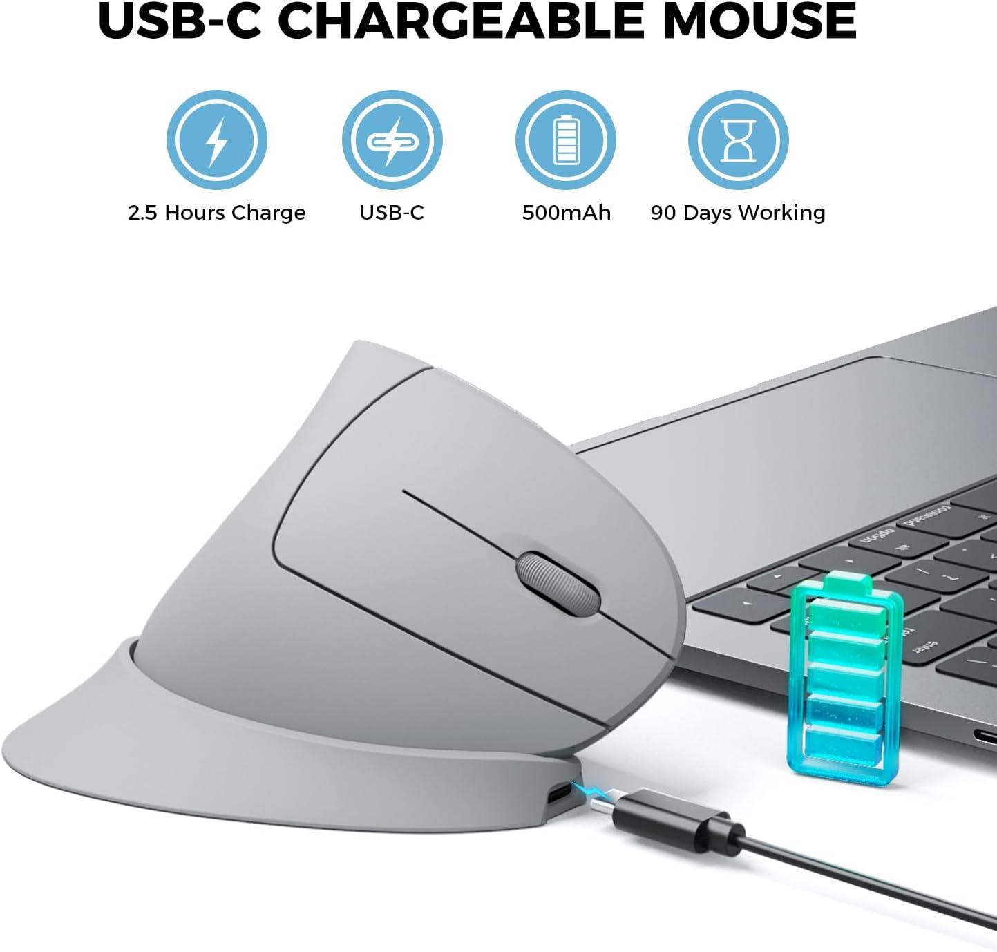 What You Get: 1*Vertical Mouse, 1*USB Receiver, 1*USB-C Charge Cable, 12 Months Warranty, 24 Hours Customer Service.