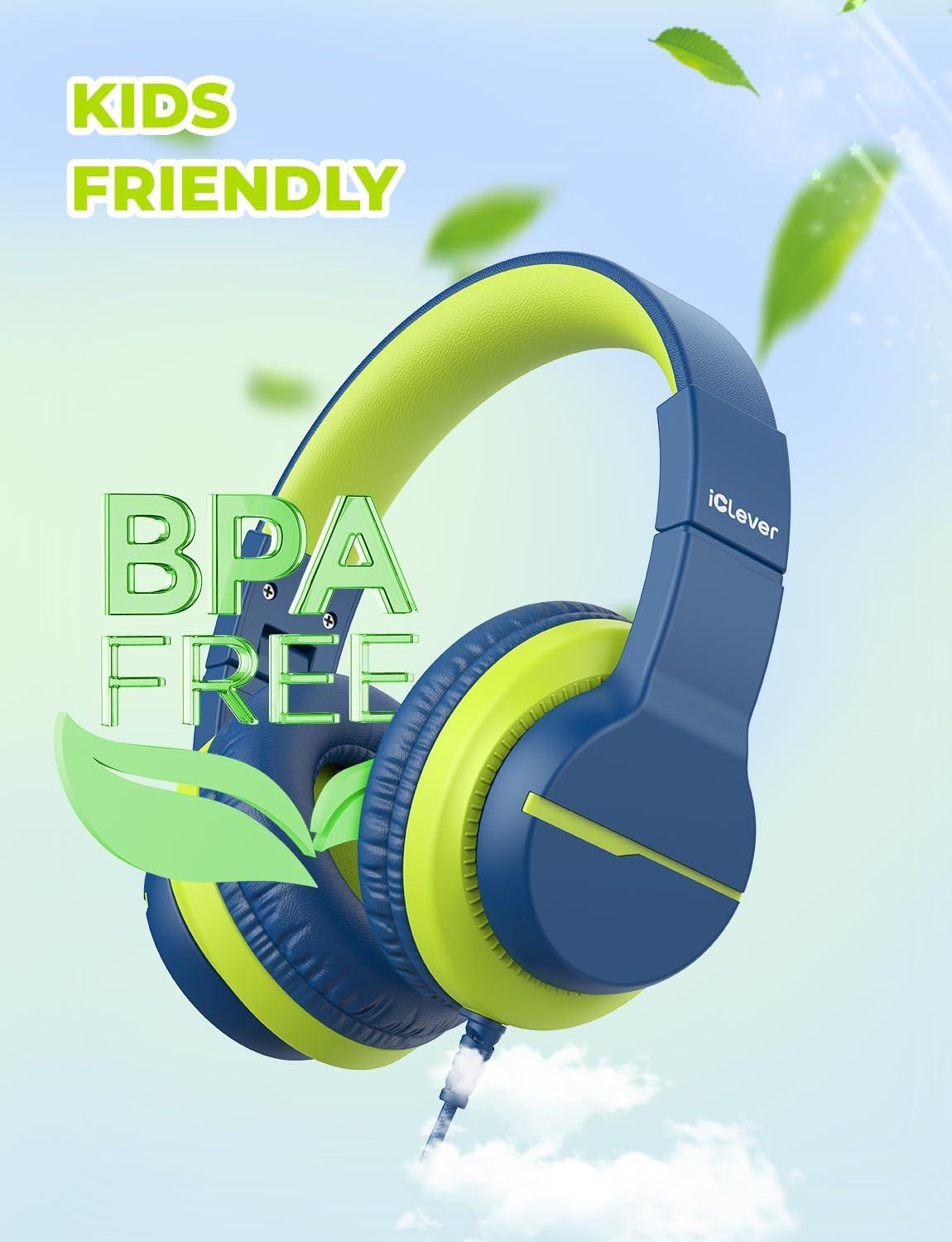 iClever Kids Headphones for School Travel, Safe Volume Limited, HD Mic Stereo Sound Over-Ear Girls Boys Headphones for Kid, FunShare Foldable 3.5mm Wired for iPad Computer, HS19(Type-C Blue Green)
